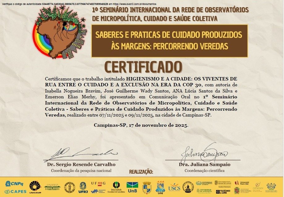 Isabella Nogueira Bravim, ex-orientanda de iniciação científica, vinculada ao projeto População em situação de rua: interseccionalidade e produção de acesso e barreira aos cuidados em saúde mental no município de Belém – PA, coordenado pelo Prof. Dr. José Guilherme Wady dos Santos, apresentou o trabalho Higienismo e a cidade: os viventes de rua entre o cuidado e a exclusão na era da COP 30, no 1º Seminário Internacional da Rede de Observatórios de Micropolítica, Cuidado e Saúde Coletiva – Saberes e Práticas de Cuidado Produzidos às Margens: Percorrendo Veredas, realizado de 07 a 09/11/2025, na cidade de Campinas – SP.